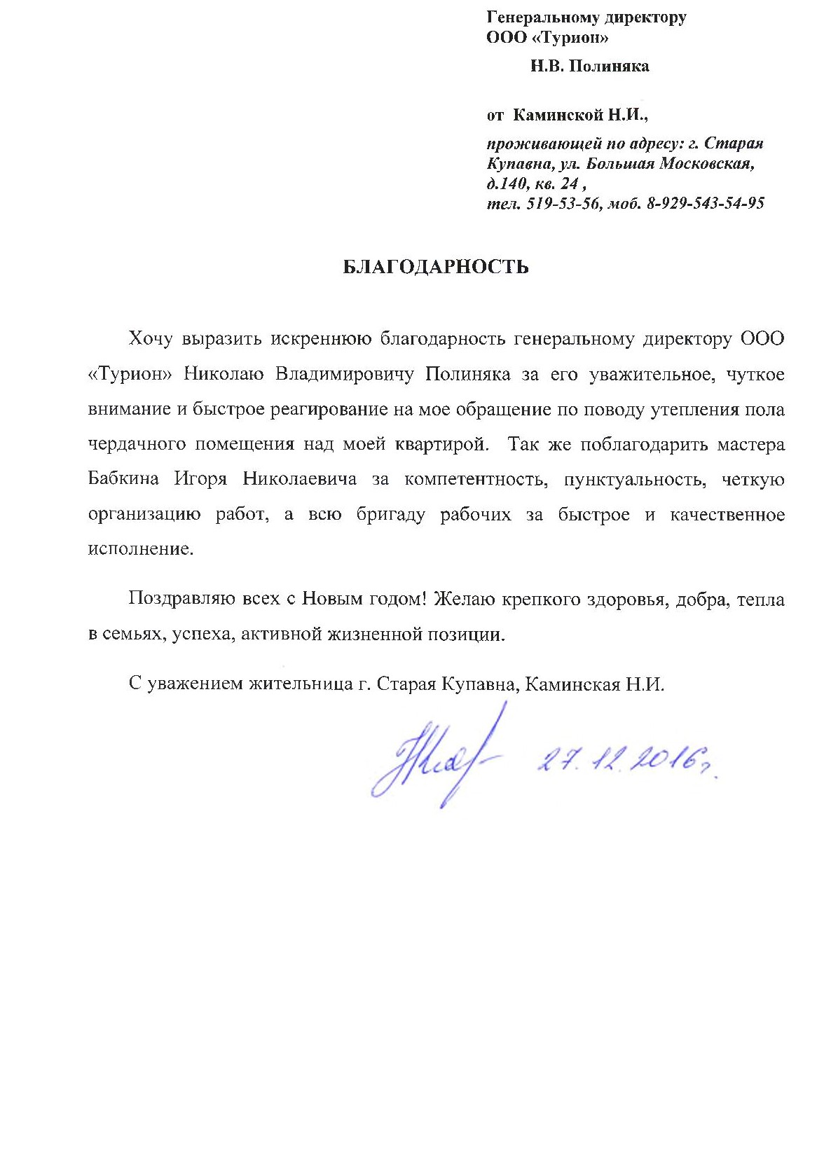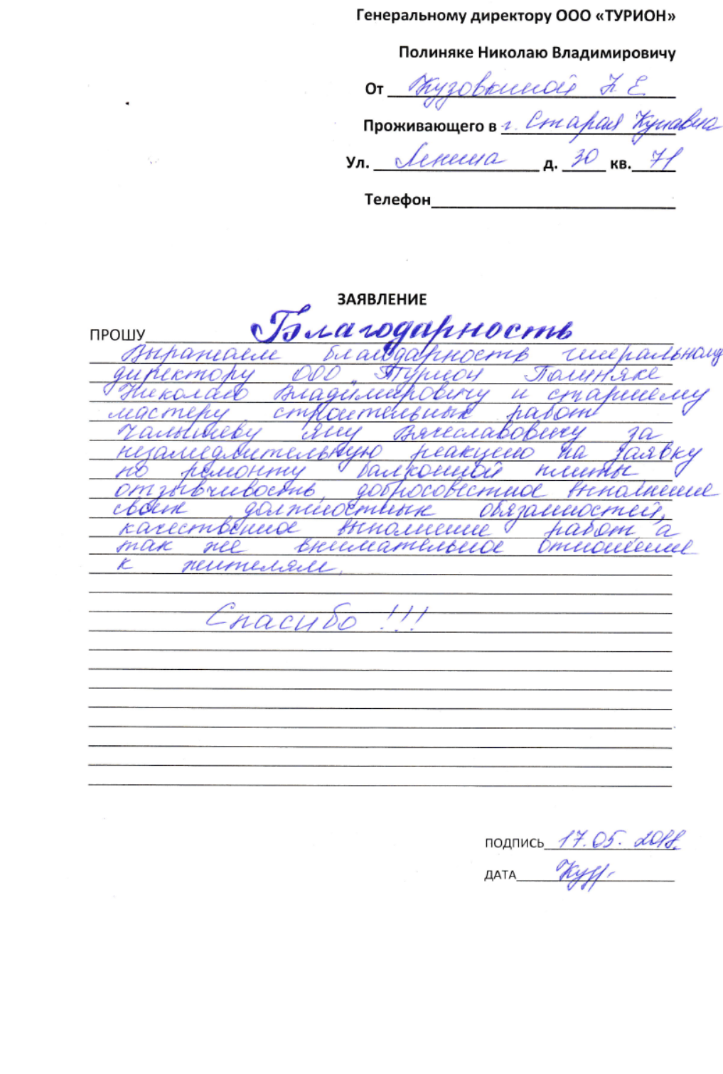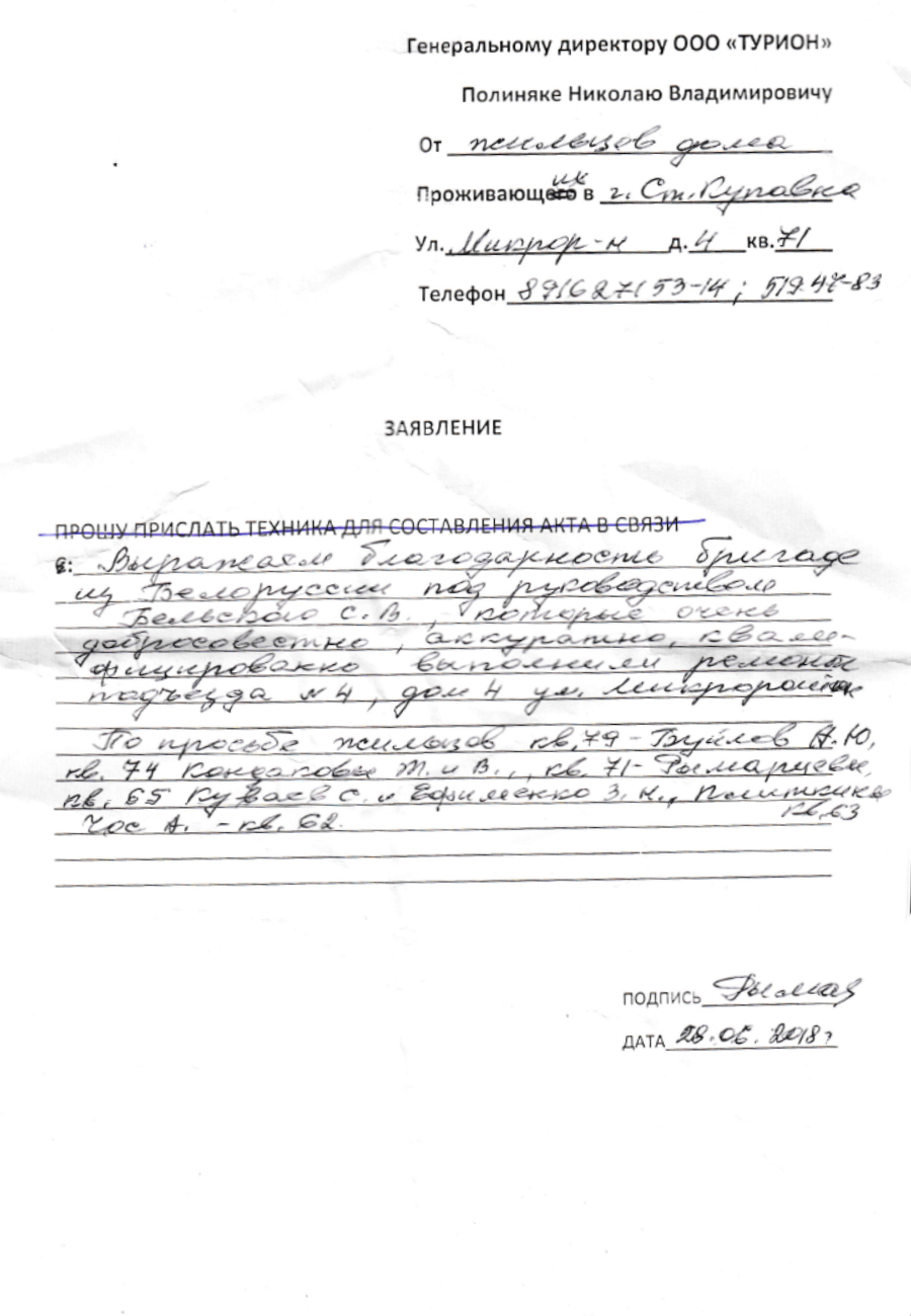 Добрый день! Выражаю искреннюю благодарность управляющей компании «Турион» и лично Полиняке Николаю Владимировичу за проявленное внимание и оперативный отклик на мою просьбу об устранении протечки кровли. Работа была выполнена в срок и качественно бригадой кровельщиков Игоря Бабкина и малярами Ольгой и Яной. Отрадно чувствовать особое внимание и неравнодушие, проявляемое вами к ветеранам и пенсионерам.